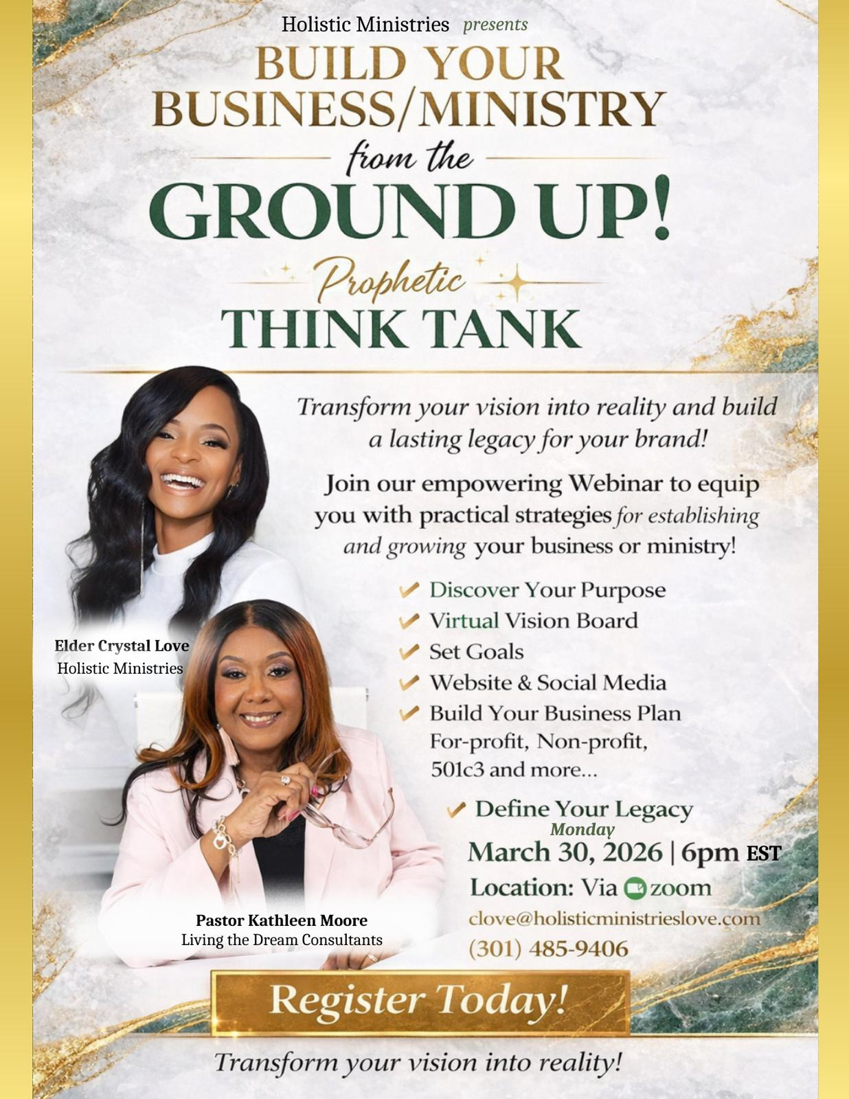 The Prophetic Think Tank is a faith-led, strategy-filled webinar designed to help visionaries turn God-given ideas into sustainable businesses and ministries. This experience blends practical instruction with prophetic insight, prayer, and intentional guidance to help you build with clarity, confidence, and purpose.